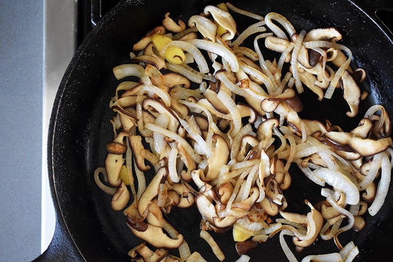 Stir-fry for about 2 minutes or until the mushrooms are cooked and the ginger is fragrant. If the pan is looking a little dry, feel free to add another tablespoon of oil.