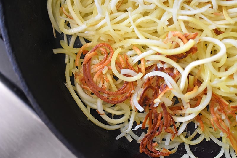 - Next, heat a large skillet over medium heat. When the skillet is hot, Add 2 tablespoons of avocado oil. Once the oil is shimmering, add the spiralized sweet potato noodles (swoodles!) in a single layer.