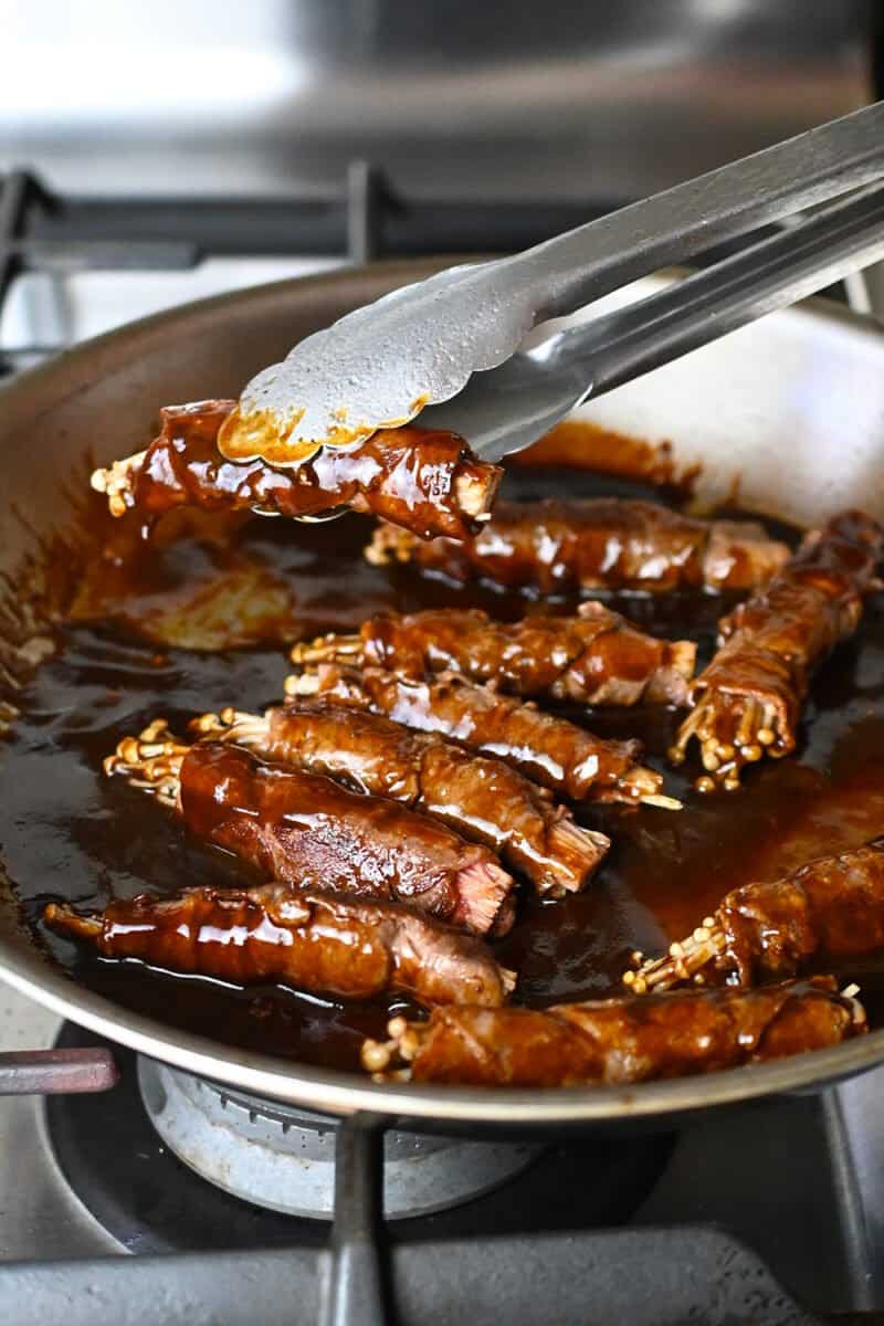- When you finish frying the beef and enoki rolls, turn down the heat to medium-low and pour the sauce into the now-empty pan. Cook, stirring, until the sauce thickens slightly.