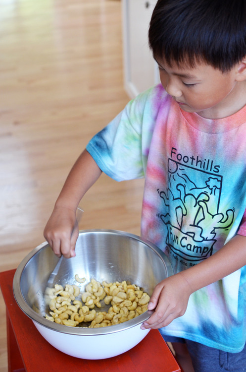 - Dump the cashews in a large bowl and add in the honey, ghee, vanilla, and salt. Mix until well coated.