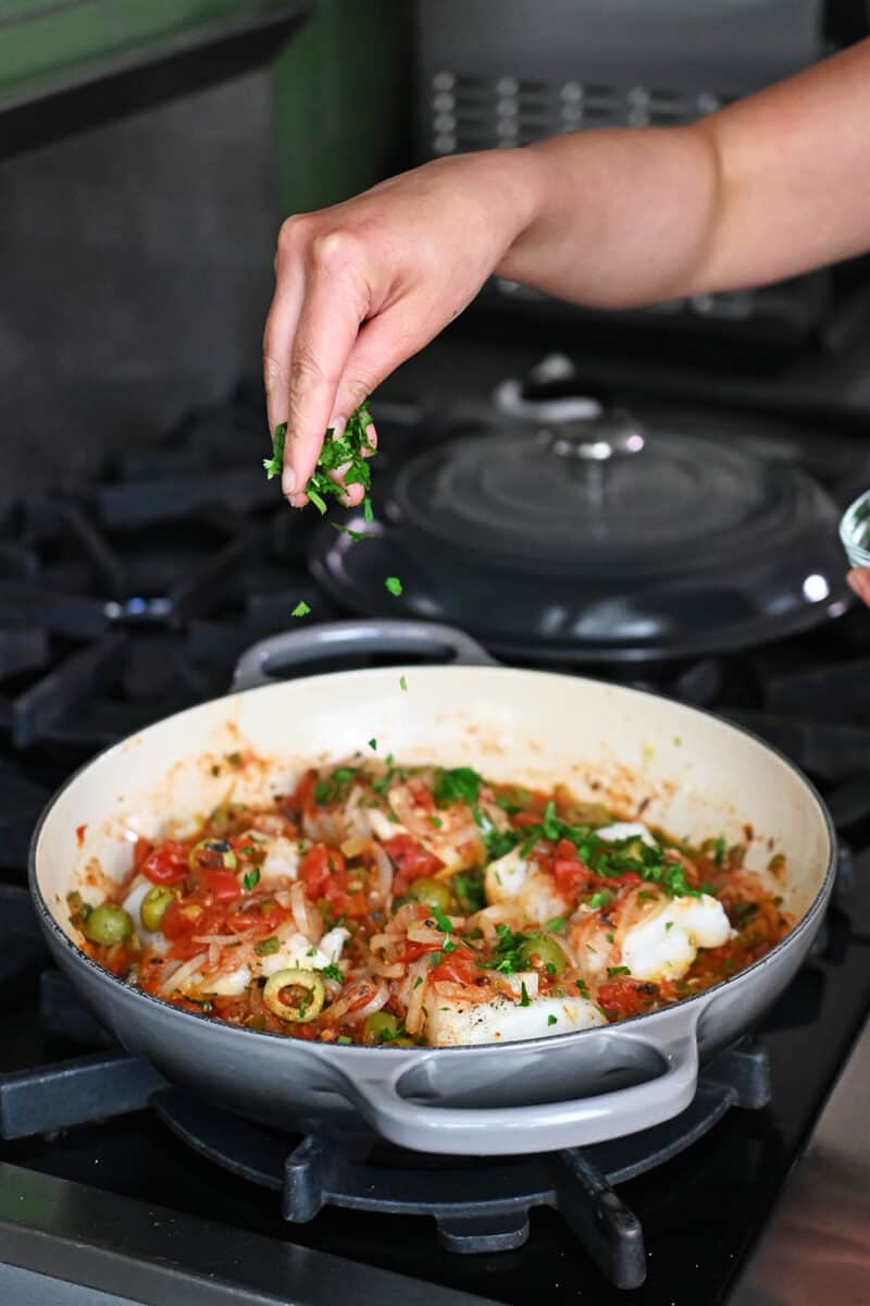 Although this dish is traditionally cooked with whole fish or fish fillets (e.g., red snapper, tilapia, cod, sea bass, etc.), you can definitely substitute a different protein. Some tasty swaps include shrimp, scallops, and boneless and skinless chicken breast or thighs. Simply season the protein with salt and pepper before simmering in the sauce until cooked through!