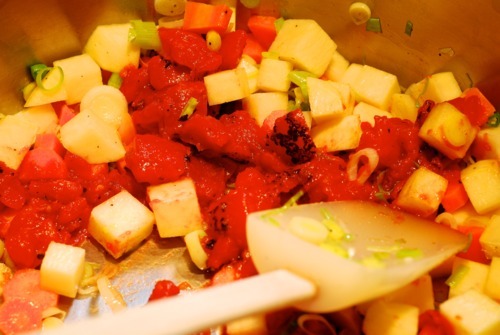 In a nutshell, I look in my crisper to find veggies that are past their prime and simmer them with some broth, sautéed alliums, and canned tomatoes until they’re nice and tender. That’s it.