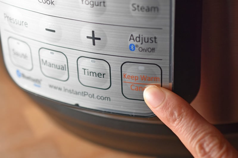 - Press the “Cancel/Keep Warm” button on the Instant Pot, and position the electric pressure cooker under the stovetop vent. (That way, you’ll protect your fancy kitchen cabinets from the steam when you release the pressure manually.)