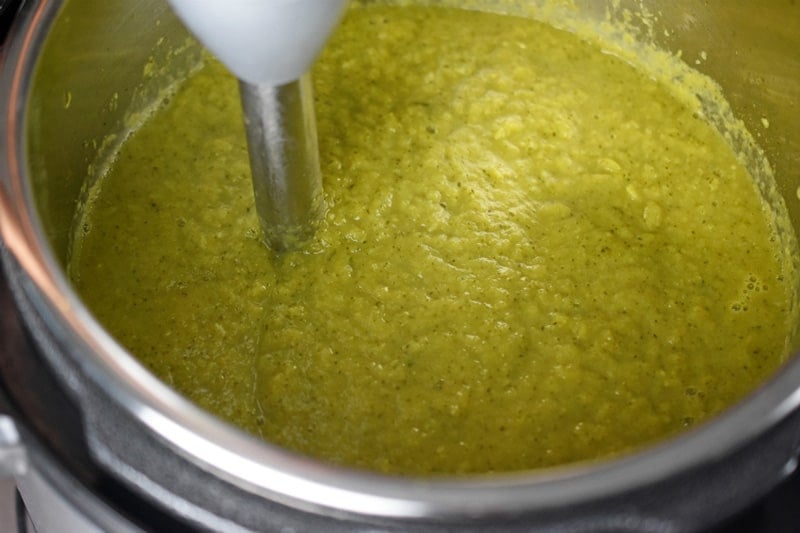 Then, use an immersion blender to blitz the soup. The result should be a smooth, aromatic green purée.