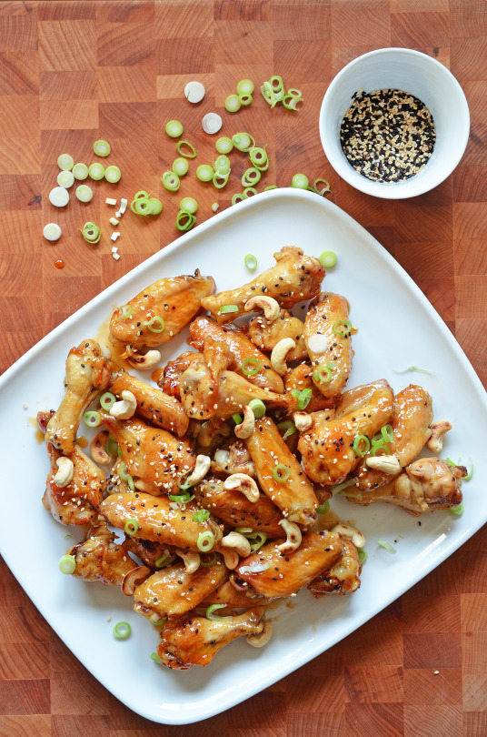 - Place the wings on a serving platter and sprinkle on the sesame seeds, scallions, and cashews. Dig in!