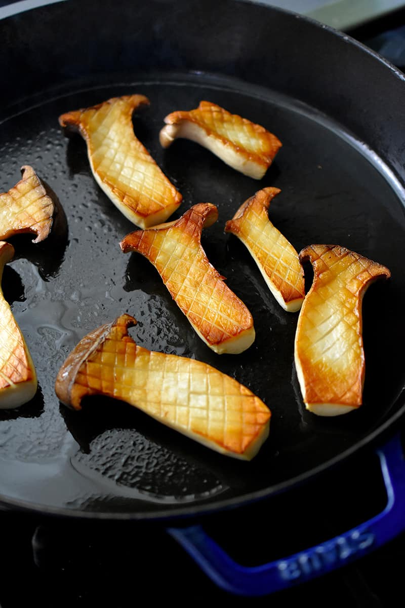 For this recipe, I cut the king oyster mushrooms in half lengthwise and then use a sharp paring knife to cut a shallow crisscross pattern on the cut surface. This extra step helps the seasoning penetrate the mushrooms and they’ll brown evenly (no curling up at the sides). Plus, it looks all fancy pants!