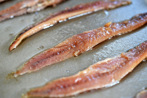 Remove the anchovy-infused oil from the heat and add the capers and red pepper flakes.