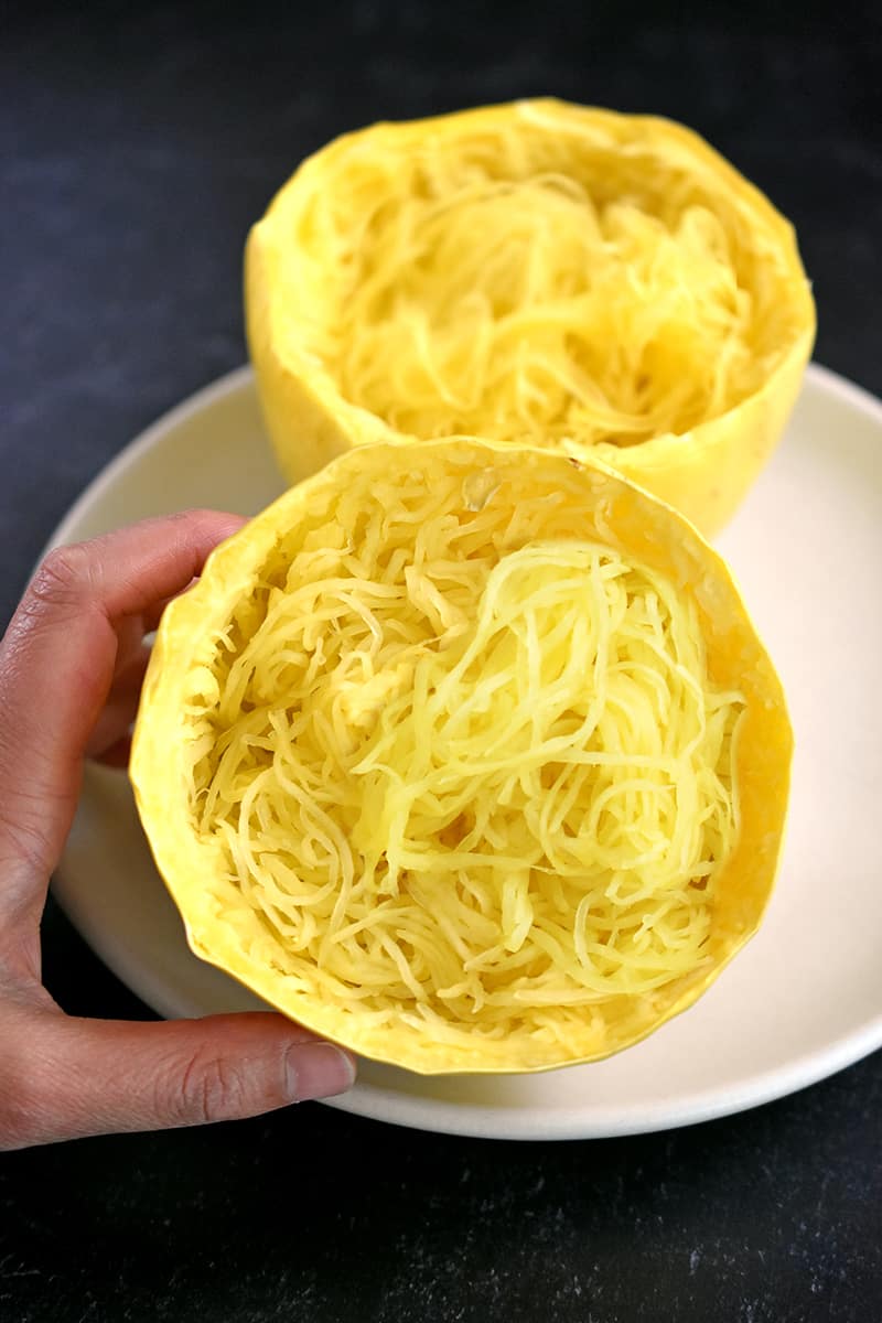 - Cool for 5 minutes and scrape the noodles out with a fork. Repeat the same steps to cook the other half of the squash.