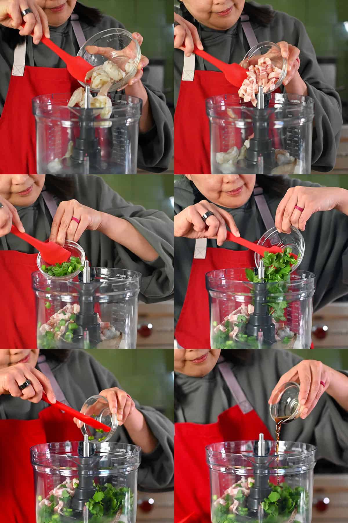 - While the mushrooms are roasting in the oven, make the shrimp filling. Toss the shrimp, bacon, scallions, cilantro, jalapeño, and fish sauce into the work bowl of a food processor.