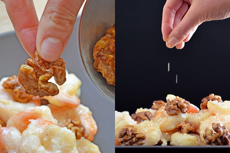 - When all the batches are done, plop the shrimp into the bowl with the honey-mayo sauce, and gently toss to coat the prawns before plating. Sprinkle the candied walnuts and toasted sesame seeds on the shrimp, and serve immediately!