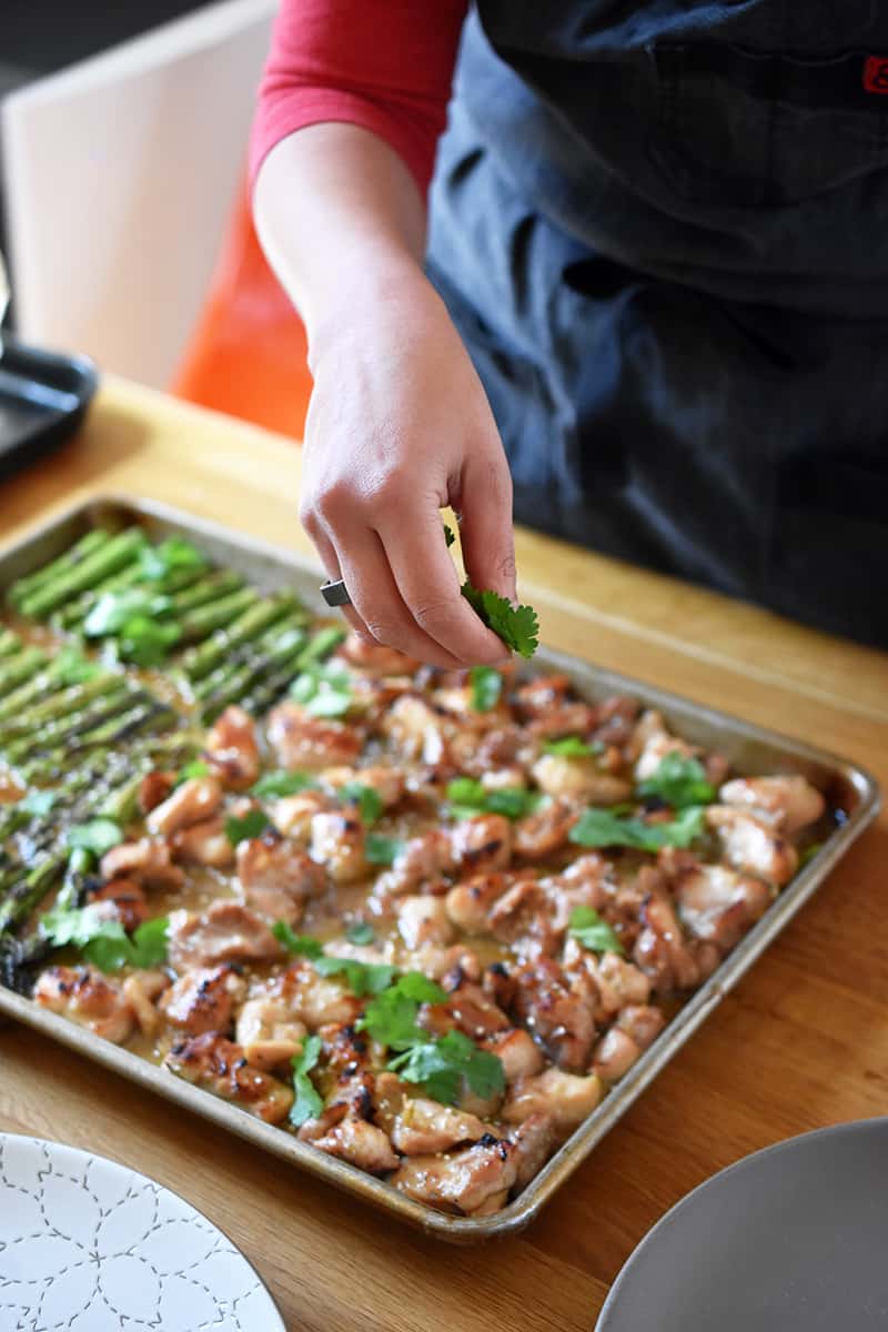 The sheet pan is ready when the chicken is cooked through, the asparagus is nicely browned and tender-crisp, and the sauce has thickened slightly.