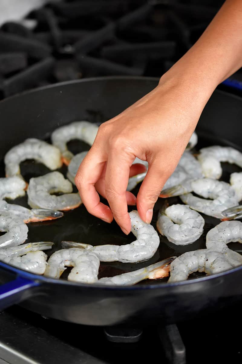 Heat a large heavy-bottomed skillet over medium high heat. When the pan is hot, add some extra virgin olive oil. Then, arrange the shrimp in a single layer in the pan.