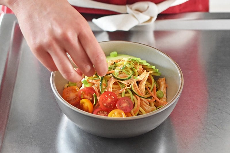- Dump the raw zoodles into the bowl of dressing and add the julienned carrots and chicken. Toss well to combine.