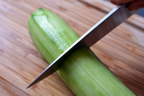 Roughly chop up the rest of the cucumber. Again, if you’ve got a wimpy blender, hack the pieces smaller.