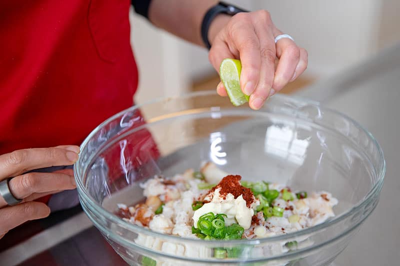 - In a large bowl, combine the crab meat, scallions, mayonnaise, red pepper flakes (if using), and lime juice. Season with salt and pepper to taste, and mix well.