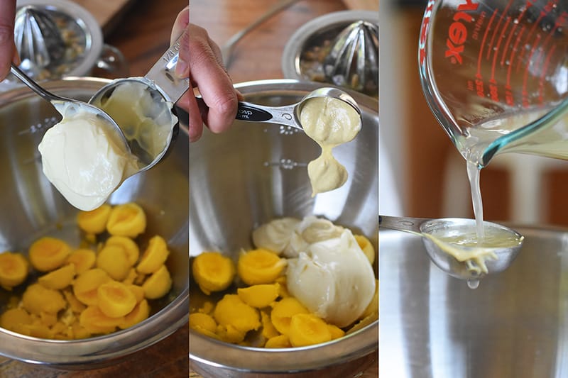 - Peel the eggs and cut them in half, lengthwise. Pop out the yolks into a bowl and add the mayonnaise, mustard, and lemon juice. Stir and smush, until mostly smooth.