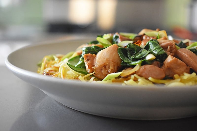 - Once the spinach is wilted, plate the chicken and veggies atop the swoodles.