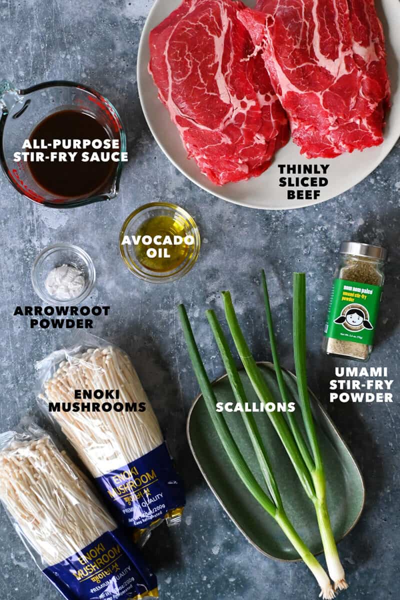 - While you’re browning the beef and enoki rolls, make the sauce by whisking All-Purpose Stir-Fry Sauce and arrowroot powder.