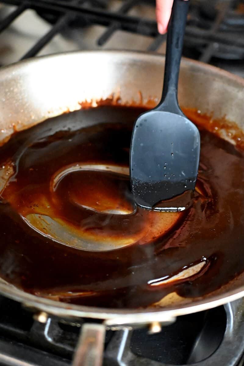 When you finish frying the beef and enoki rolls, turn down the heat to medium-low and pour the sauce into the now-empty pan.