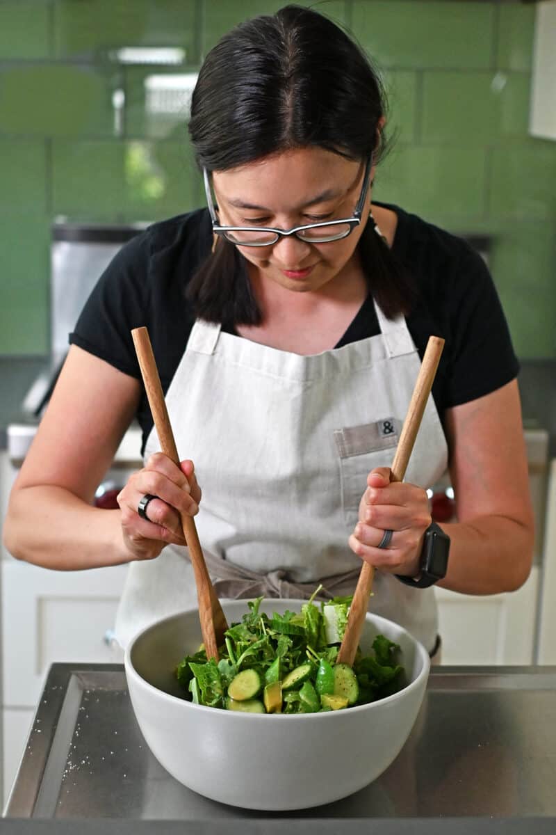 - Add a variety of veggies! It’s the interplay of textures and flavors that makes this chopped salad delicious, so make sure you use more than just a store-bought bag of mixed salad greens in this recipe. If you don’t like the veggies I picked for this salad, choose your own: red bell peppers, carrots, cherry tomatoes, iceberg lettuce, Napa cabbage, green cabbage, radicchio—whatever floats your boat!