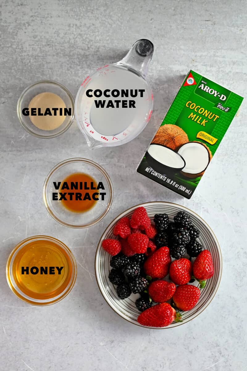 An overhead shot of the raw ingredients to make paleo and dairy-free coconut jelly, a Melo Melo copycat recipe