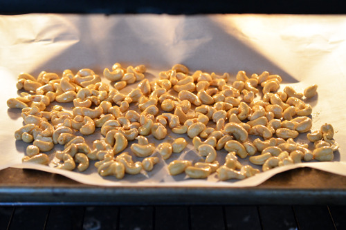- Dump the cashews in a large bowl and add in the honey, ghee, vanilla, and salt. Mix until well coated.