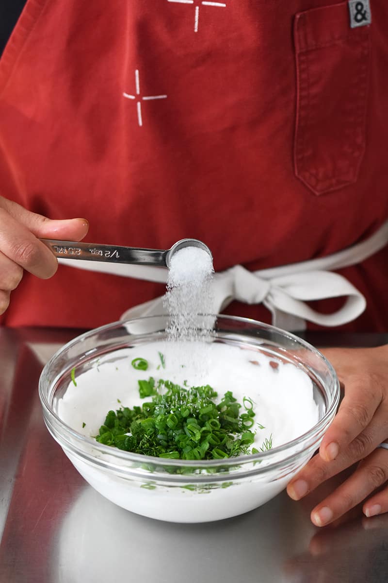 - Roughly chop the herbs. In a small bowl, combine the yogurt, most of the herbs, the scallion, and the salt.