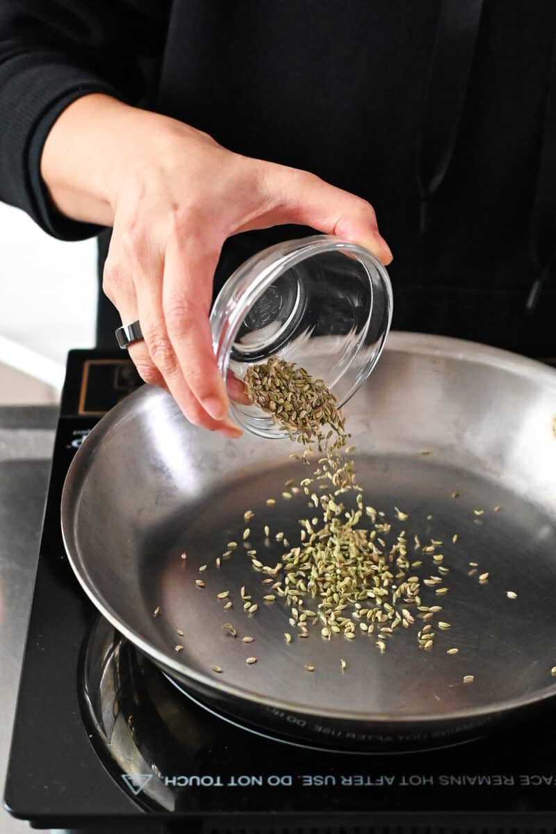 - In a small skillet over medium heat, toast the fennel seeds, shaking occasionally, until fragrant, about 3 minutes. Transfer the toasted fennel seeds to a plate to cool to room temperature.