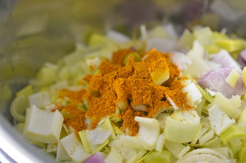 Turn on the sauté function on the Instant Pot, and add your fat of choice once the stainless steel insert is hot. Add the chopped leeks, shallots…