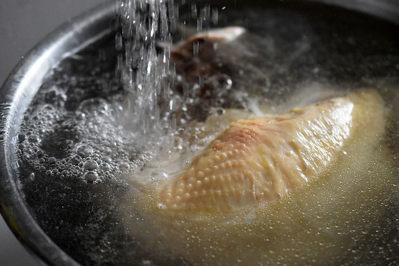 Pour off the water, partially cover, and set the chicken aside to cool.