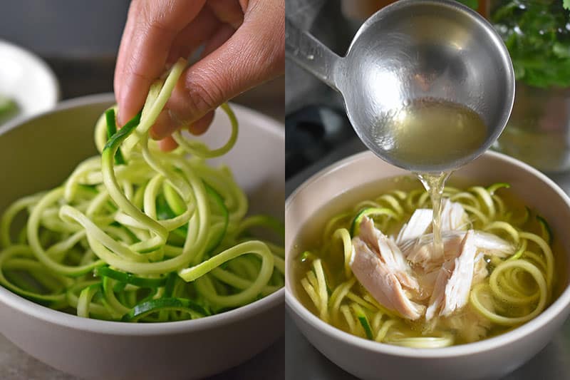 - Divide the zucchini noodles among four soup bowls. (If you like softer zoodles, use a mesh strainer to dunk them in boiling water until the desired softness before placing the drained zoodles into the soup bowls.) Top the zoodles with shredded chicken.