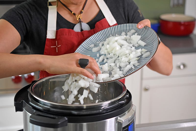 Someone adding diced onions to an open Instant Pot.