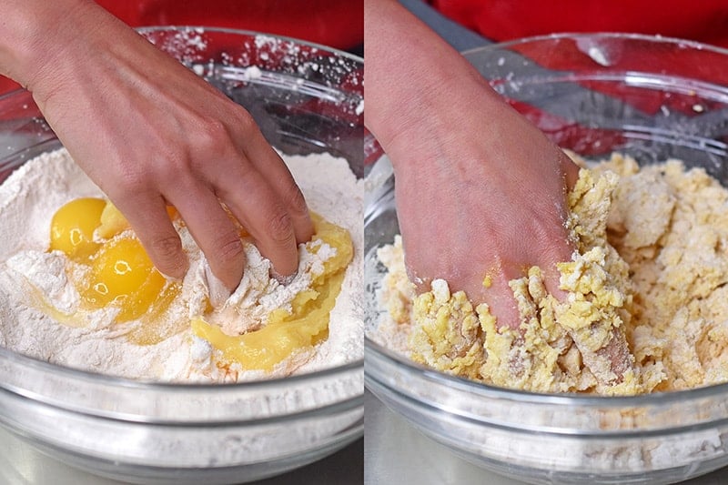 - Add the ghee and two eggs to the dry mixture. Mix well with your hands until the dough is crumbly and the the ghee and egg are well incorporated.