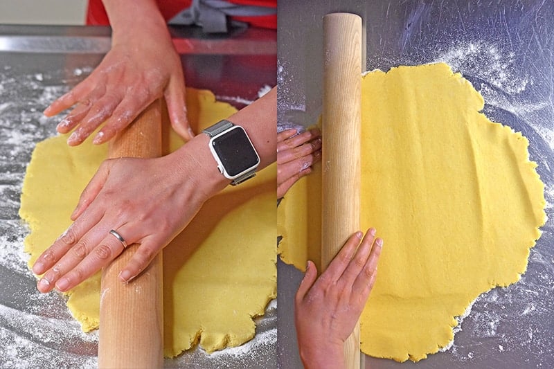 - Dust the work surface with cassava flour. Next, grab a rolling pin and roll out the dough so that it’s about ⅛-inch thick. The dough can be a little sticky, so feel free to roll the dough between two pieces of parchment paper or plastic wrap. (A can also be very helpful in pulling the dough off the work surface.)