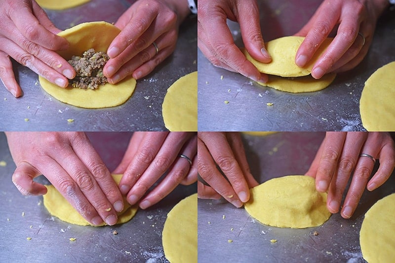 …to each circle of dough. Fold the dough over the top and pinch the edges together with your fingers. Don’t overfill the pies or you won’t be able to seal them! Arrange the meat pies on two rimmed baking sheets lined with parchment paper, making sure they’re evenly spaced.