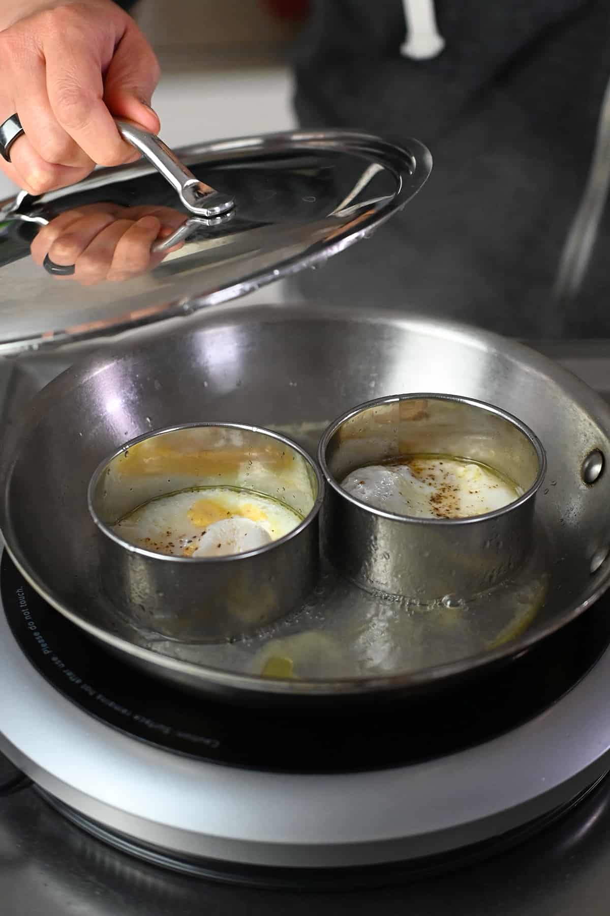 Heat a skillet over medium-high heat and add some ghee when the pan is hot. (Make sure you’ve got a tight-fitting lid for this skillet.) When the ghee’s shimmering, place the two greased biscuit cutters in the pan, and pour an egg into each mold.