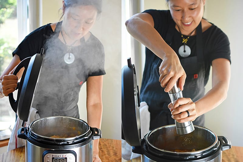 Remove the lid right away to prevent overcooking. Add the freshly cracked black pepper and adjust the seasoning with additional salt as needed.