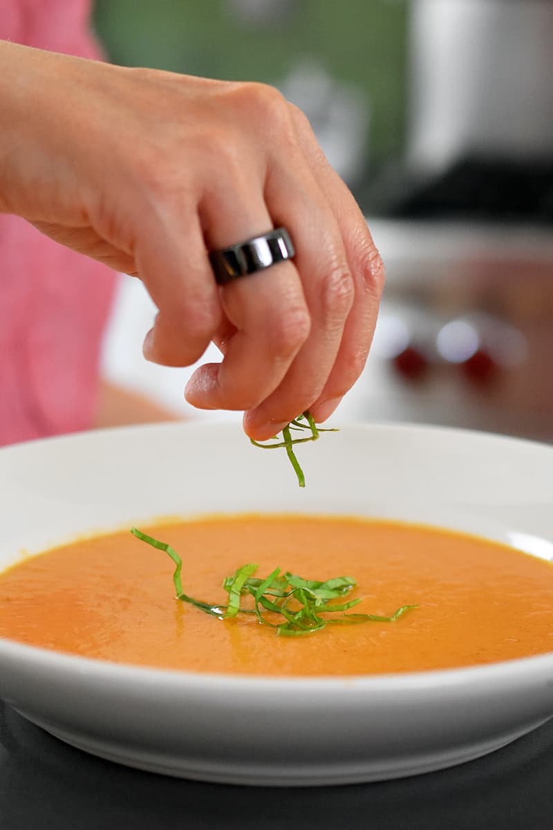 - Taste the soup and adjust the seasoning with salt and pepper. Ladle up the soup and garnish with basil.
