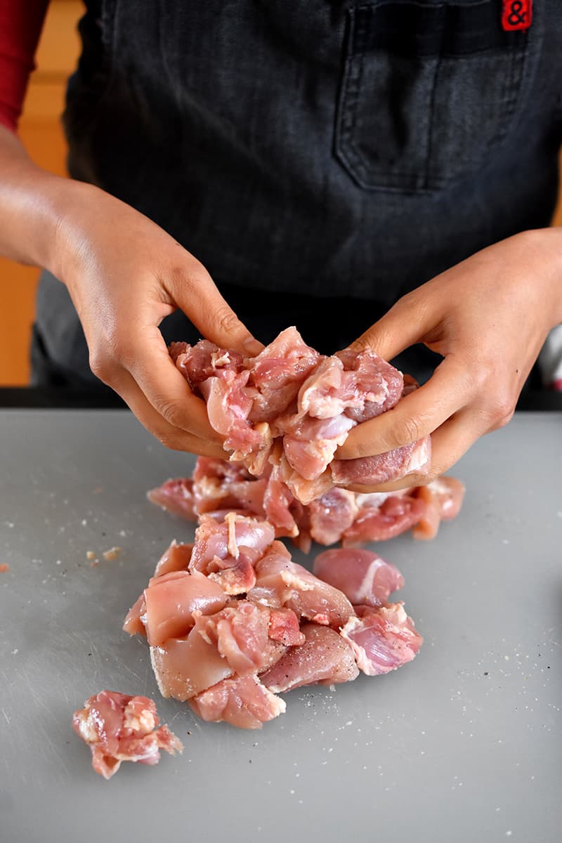 - Pat the chicken thighs dry with paper towels and cut into 1½- to 2-inch pieces.