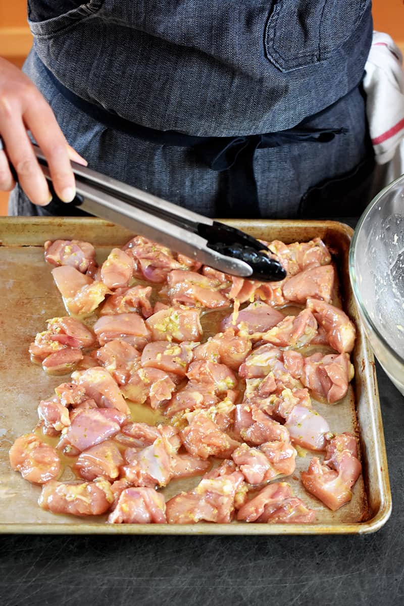 - Lightly grease a sheet pan with some avocado oil. Use tongs or a slotted spoon to transfer the chicken onto the sheet pan in a single layer on one side of the pan.