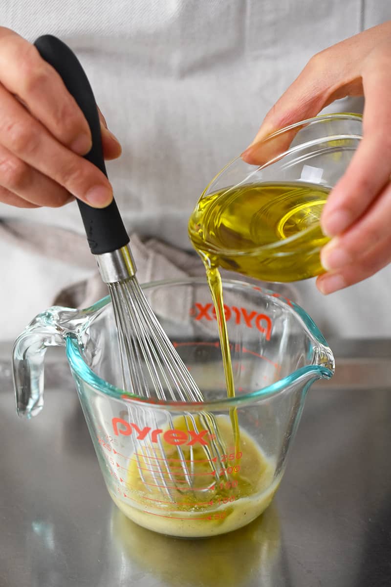 Slowly whisk in the extra virgin olive oil until a uniform suspension forms. Taste and adjust seasoning with more vinegar, olive oil, salt, and/or pepper if needed.