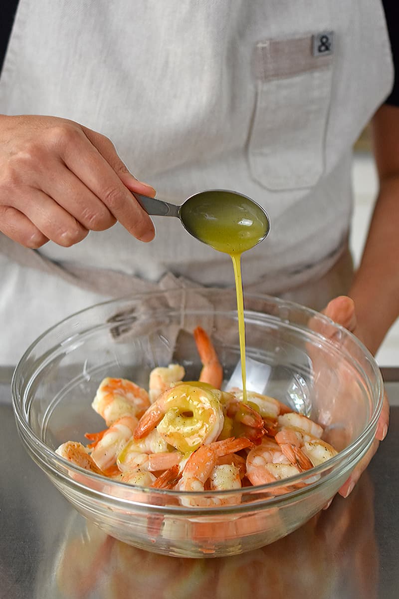 - Spoon 2 tablespoons of the dressing over the cooked shrimp and toss well. Set aside to let the flavors meld and for the shrimp to cool down a little.