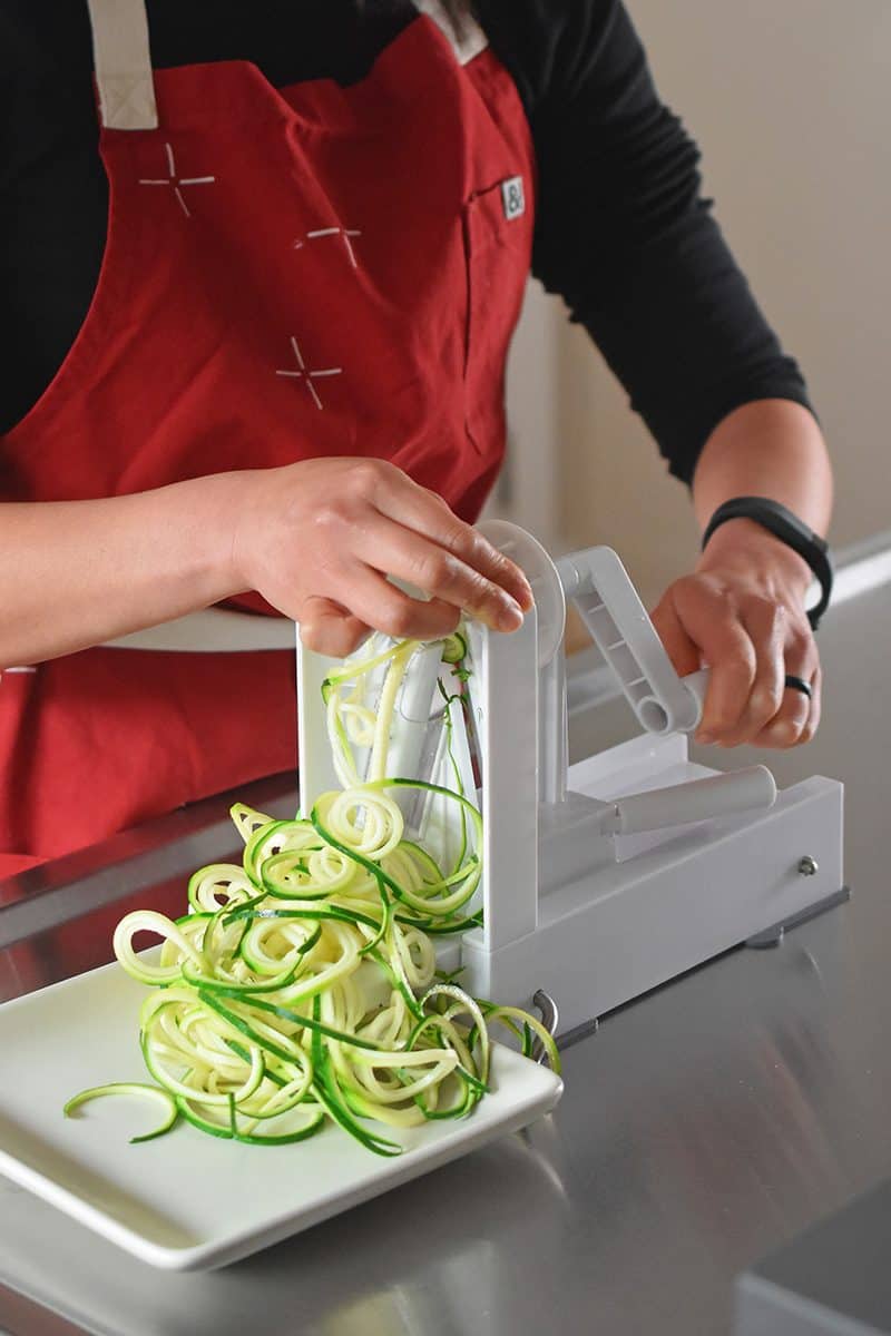 I have three different spiralizers I love that transform zucchini into noodles (a.k.a. zoodles) in a jiffy. The Oxo Tabletop Spiralizer is great, but you end up with a little more veggie waste at the core. If you’re not going to make veggie noodles all the time, you can just buy an inexpensive julienne peeler or an Oxo handheld spiralizer.
