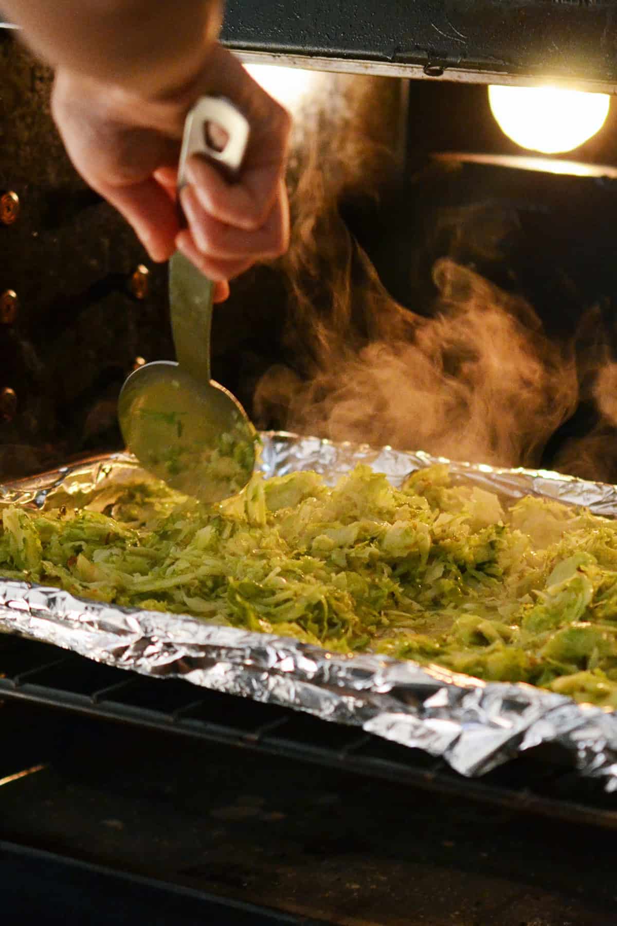 Spread the shredded sprouts evenly on a greased rimmed baking sheet. (You can also line the baking sheet with aluminum foil or parchment to make clean-up a breeze.)