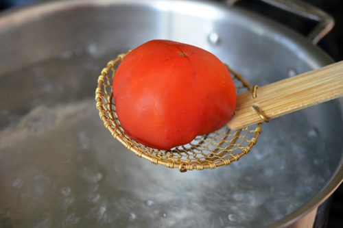 As I mentioned, peeling the tomatoes makes a HUGE difference in the final texture and taste of the soup. And tomatoes are easy to peel after you quickly blanch them and shock them in ice water.