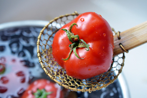 - Cut a small ‘X” on the bottom of each tomato with a sharp paring knife and drop them into the boiling water for 30 seconds. Transfer the tomatoes to the bowl of ice with a slotted spoon. After the tomatoes chill in the bowl for a minute or two, their skins should slide right off.
