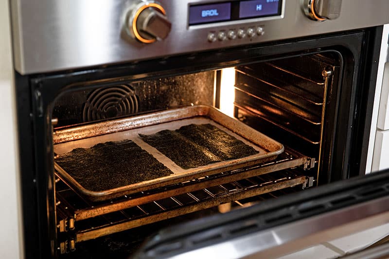 No gas stovetop? You can also toast the nori in the oven. Turn on the broiler with the rack about 6 inches from the heating element. Place two pieces of nori on a baking sheet and pop them in the oven for only 10 seconds or until they turn green and smell toasty.