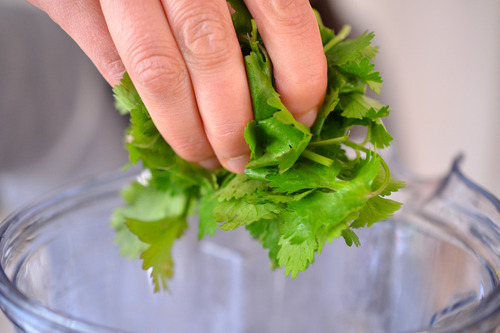 - Toss the onion, peppers, garlic, cilantro, ground pepper, lime zest and juice, fish sauce, and coconut aminos into a blender, and blitz everything together until a bright green purée is formed.
