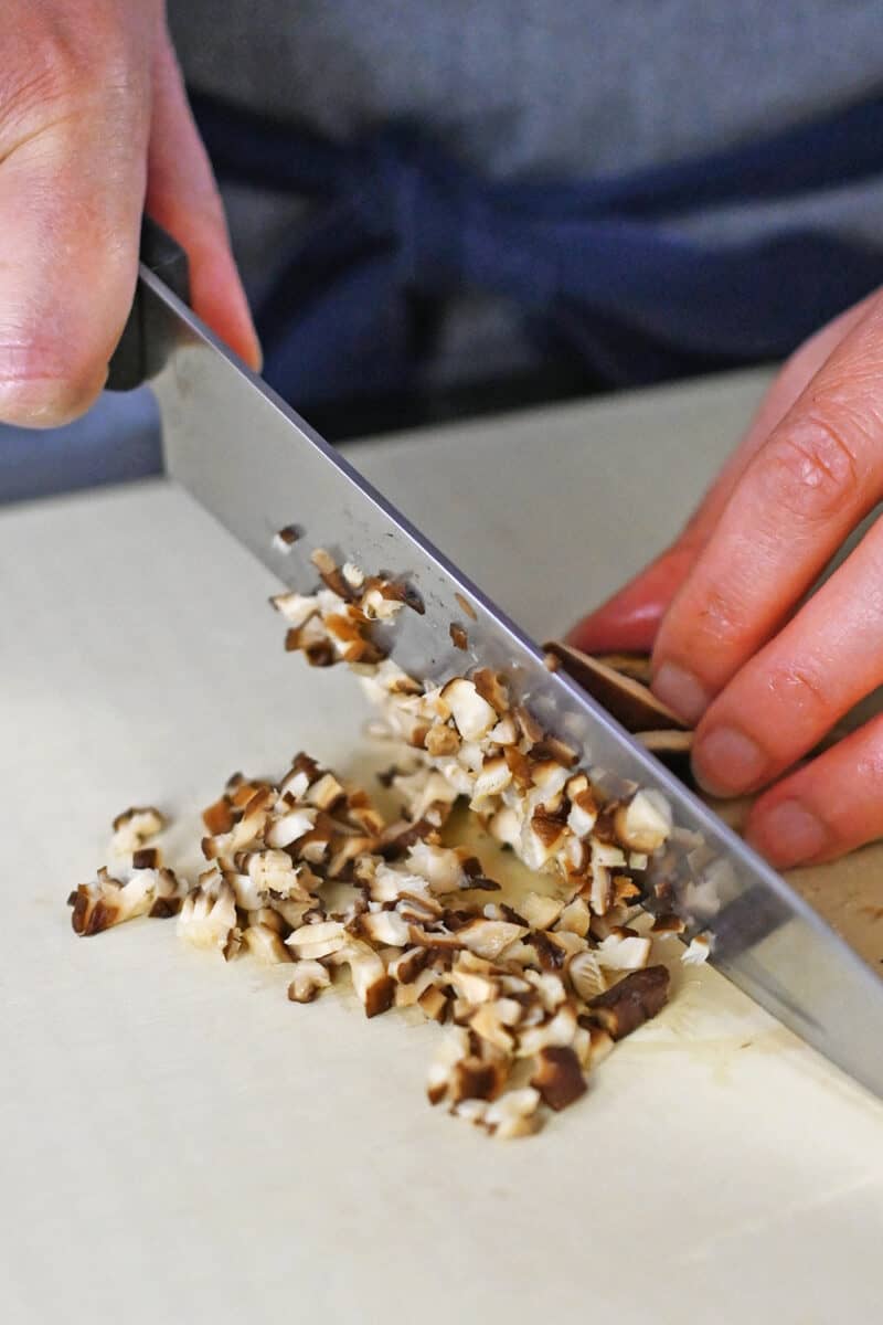 Closeup of someone finely chopping rehydrated dried shiitake mushrooms on a cutting board.